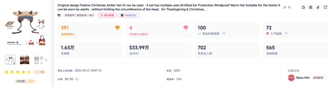 产品售价21.90美元,近28天销量达1.47万单,销售额为31.31万美元(约人民币222.75万元)。达人内容多围绕“圣诞礼物推荐”“最可爱的保暖毛线帽”展开,视频带货占比高达84%。
