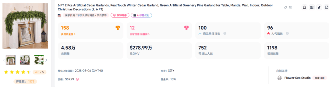 产品售价69.99美元,近28天销量达2.52万件,带动销售额167.25万美元(约合人民币1189.97万元)。达人视频带货贡献了80%的销量,博主常以“真实触感圣诞花环”为主题,将花环与铃铛、蝴蝶结、灯串搭配演示,营造浓厚节日氛围。